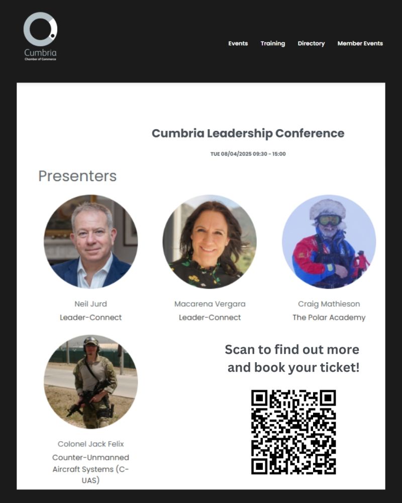 The Cumbria Leadership Conference hosted by the Cumbria Chamber of Commerce will take place on the 8 April25 at The Villa Levens and Leader-Connect will be heavily involved.