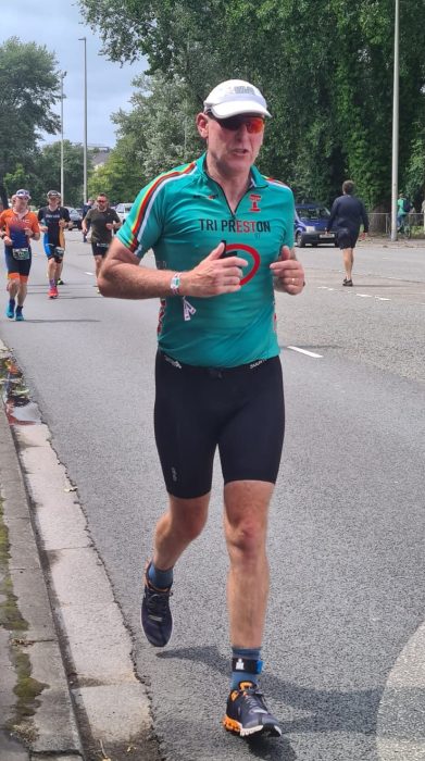 Back to the event. The swim went well even though there was jellyfish everywhere – nobody mentioned them in the pre-race brief! As I was getting ready to go on the bike, the rain started to fall a bit heavier, and I decided to put a waterproof Gillet on – what a good move. After 10 mins of cycling the heavens opened and for the next 3 hours it absolutely poured down – to coin a phrase, I was “wetter than an Otter’s pocket”. This turned the first 35 miles of the cycle into an absolute slog as, in addition to the rain, it was mainly uphill, into a headwind and the few downhills were treacherous. All the time – I had to focus on my CCP and not panic trying to make up time which ultimately would have been detrimental.